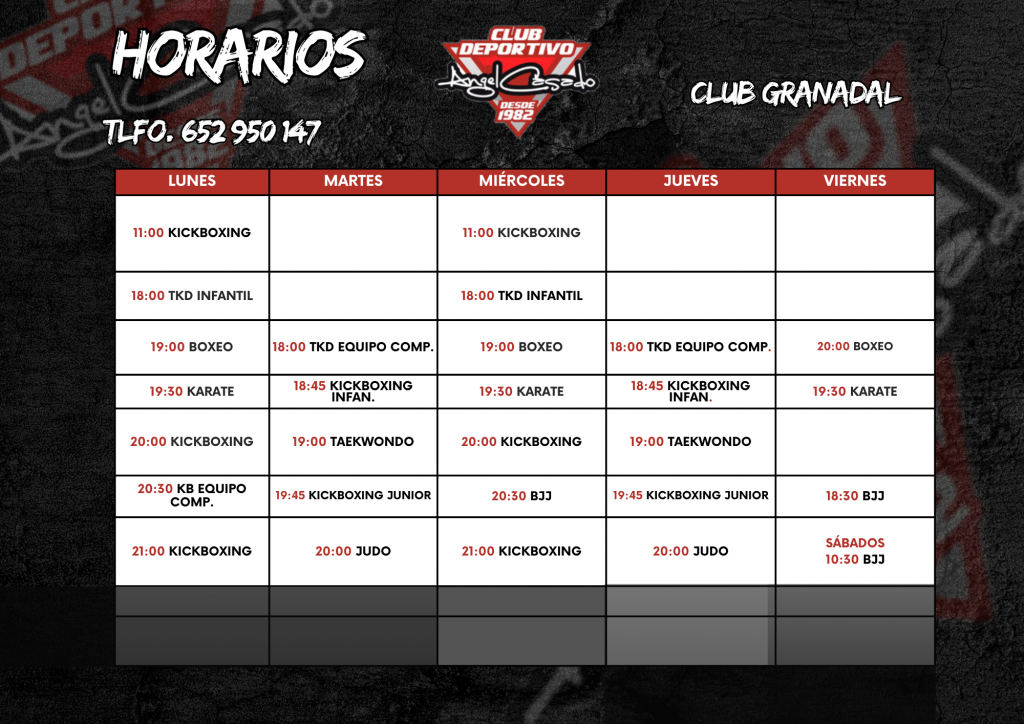 Aquí puedes comprobar los horarios actualizados de los clubes Angel Casado: Pol industrial el Granadal en la calle plata, s/n y en la Calle Isla Hierro, local 4.
